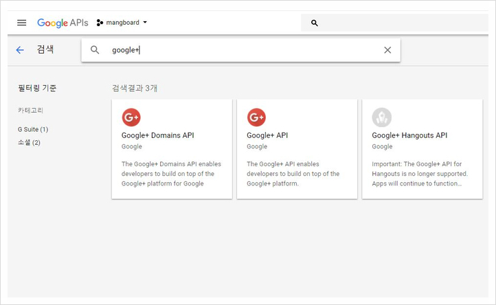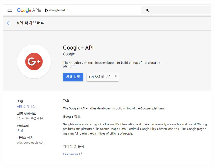 검색결과에서 Google+ API를 선택합니다.