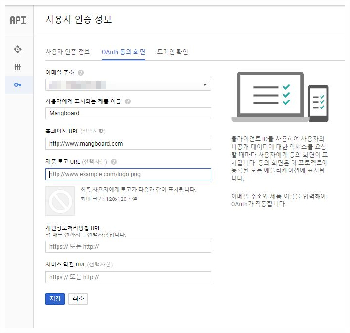 7. 상단에 Oauth 동의화면 메뉴를 클릭하고 제품이름, 홈페이지 URL 등 관련 정보를 입력합니다.