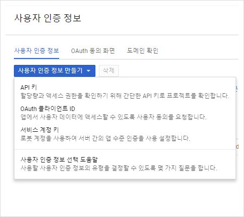 5. 왼쪽 메뉴에서 사용자 인증 정보 메뉴를 클릭하고, 사용자 인증정보 추가>API 키 를 클릭합니다.