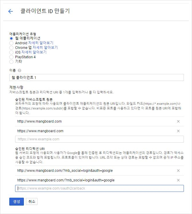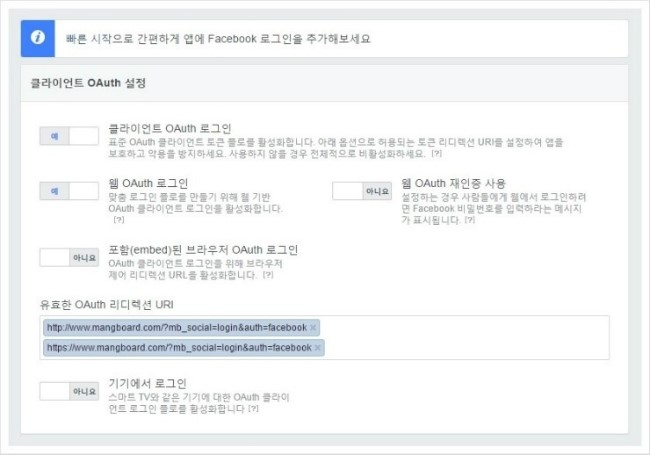 – 주소가 다를 경우 “OAuth 리디렉션 URI” 항목에 “https://www.mangboard.com/wp/?mb_social=login&auth=facebook” 추가
