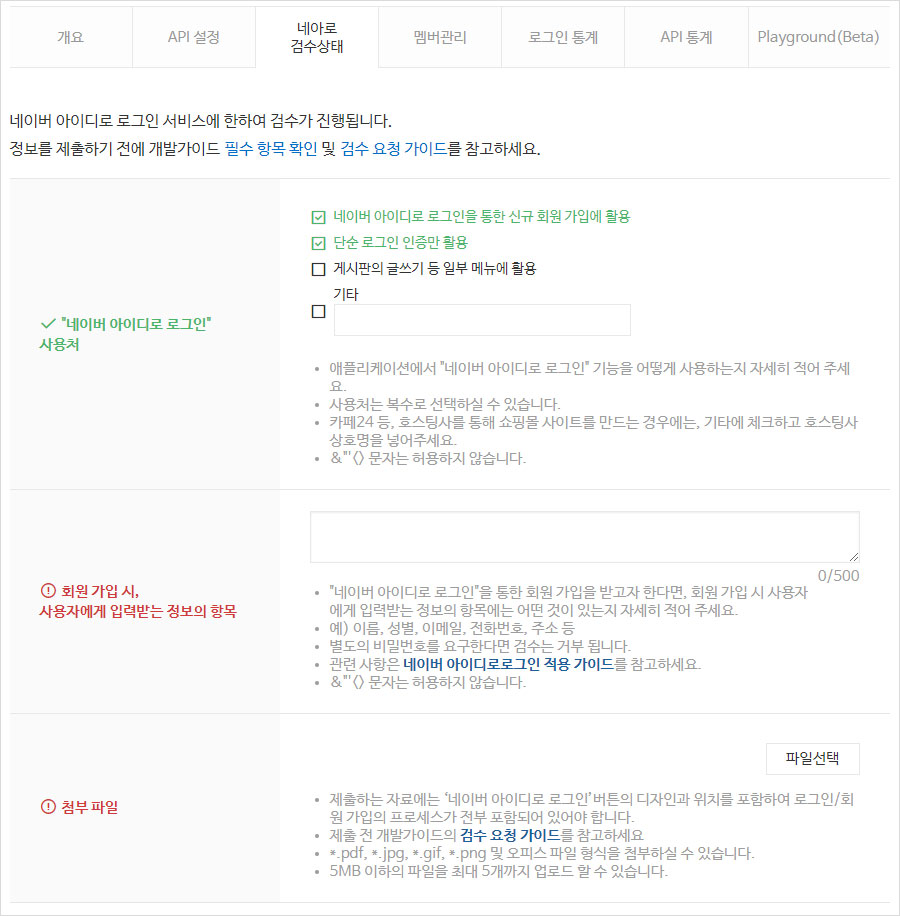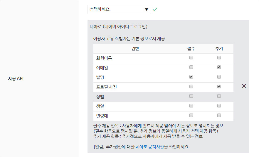 4. “네이버 아이디로 로그인,단순 로그인” 사용처를 체크하고, 회원 가입 시, 사용자에게 입력받는 정보의 항목을 입력합니다.