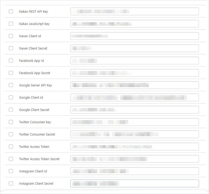 위에서 생성한 네이버, 카카오, 구글, 페이스북, 트위터, 인스타그램 앱키를 전부 망보드 옵션 설정에 입력하고,