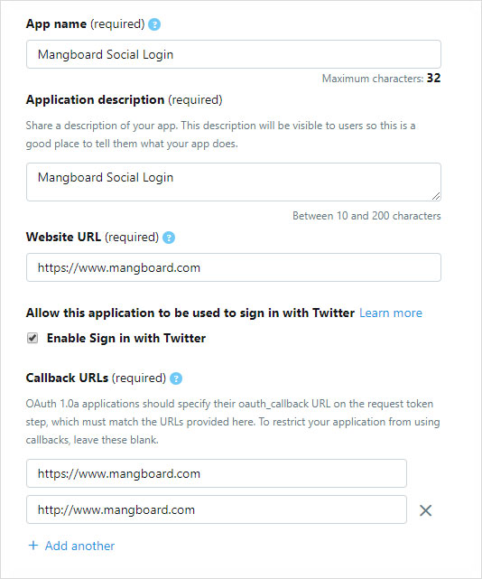 트위터의 Callback URL은 홈페이지 주소와 동일하게 입력해 줍니다