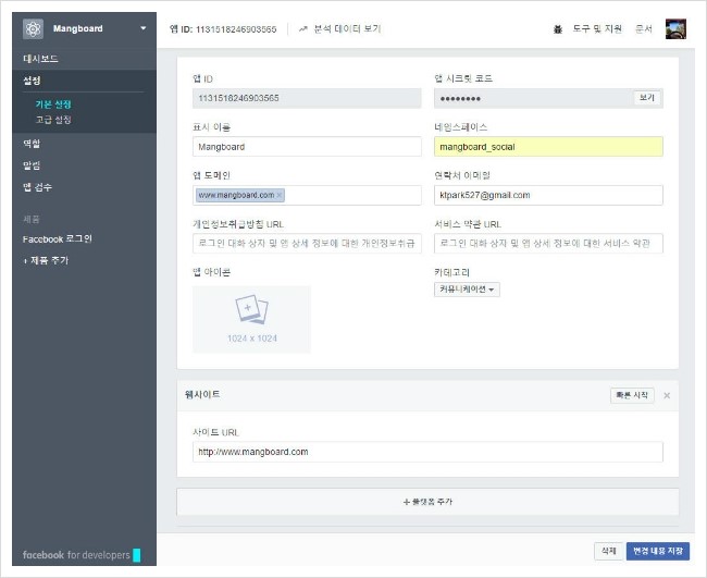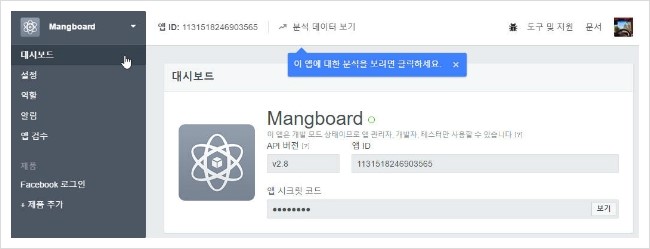 4. 왼쪽 메뉴에서 Dashboard 메뉴를 클릭하고 App ID, App Secret 정보를 망보드 관리자>옵션설정에 입력합니다.