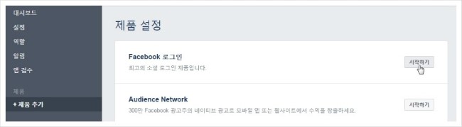 5. 왼쪽 메뉴에서 +제품추가 메뉴를 클릭하고 Facebook 로그인 시작하기 버튼을 클릭합니다.